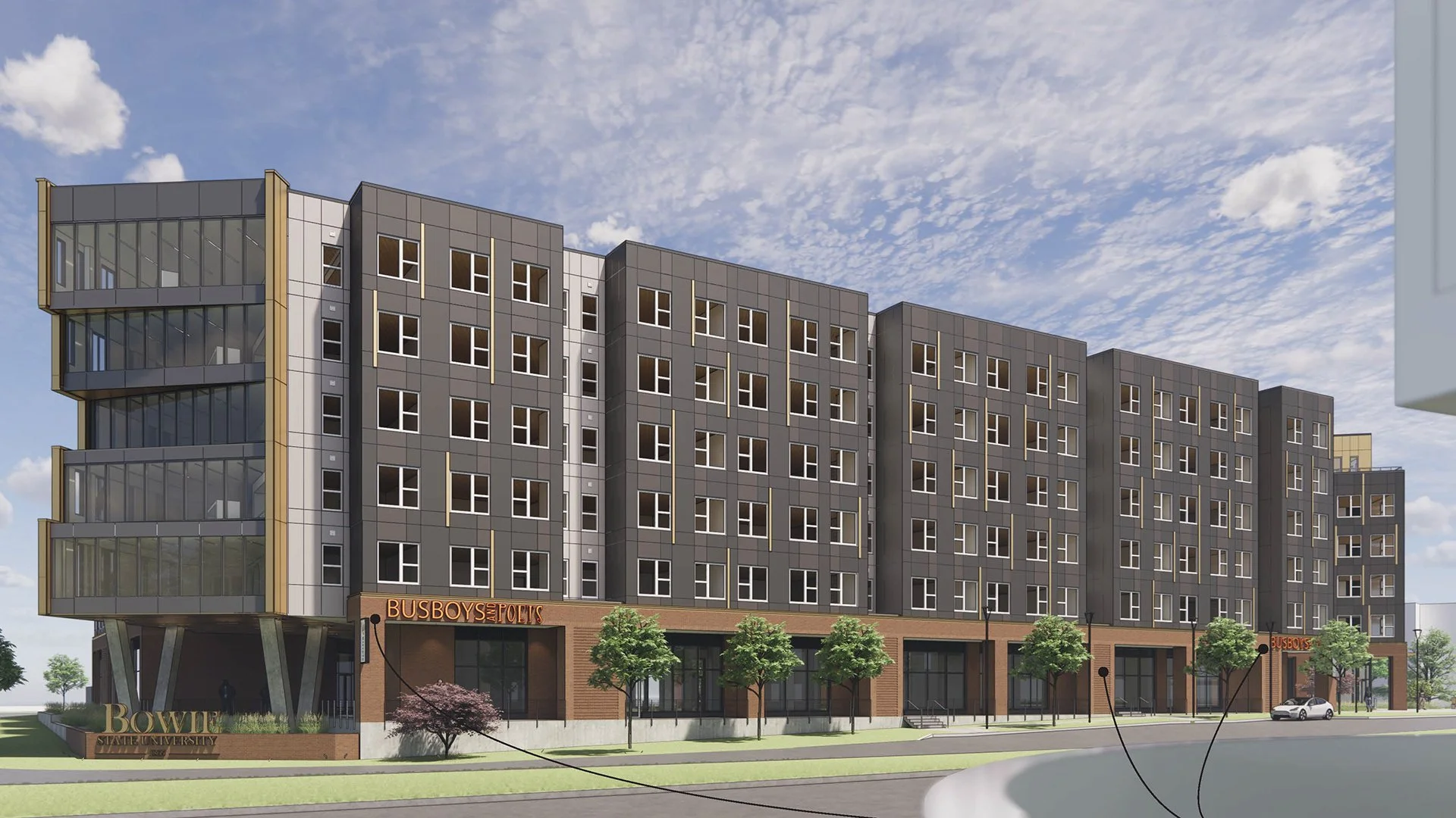 PROJECT SUMMARY: The Gateway is a new apartment-style university housing project located at the entrance to the Bowie State University campus, hence the name. The approximately 180,000 SF scope includes five levels of living units over ground floor retail and office. Given the increasing costs of construction, the main challenge was to meet the design requirements of the various stakeholders while also adhering to tight budget.